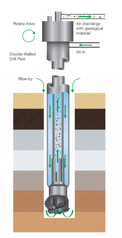 ·Suitable for large hole drilling, improving drilling efficiency.New drilling techniques have been developed on the basis of double-walled drill pipe, the most typical representative of it are RDM (Reel Well Drilling Method) and RCCD (Reverse Circulation Centre Discharge).