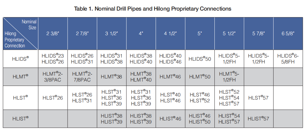 • Hilong proprietary drill pipe