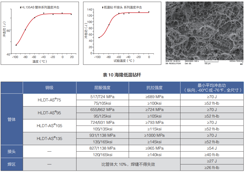 和普通鉆桿相比,該產(chǎn)品具有更好的低溫韌性,包括更高的沖擊功和更低的韌脆轉(zhuǎn)變溫度,具有更優(yōu)的抗脆斷能力。如在常溫使用,具有比普通鉆桿更高的抗斷裂和疲勞能力,使用壽命可顯著提高。